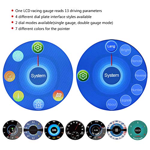 【Funzioni multiple】 Un indicatore da corsa LCD legge 13 parametri di guida, RPM, temperatura dell'acqua, turbo, temperatura di scarico, temperatura dell'olio, pressione dell'olio, temperatura dell'aria di aspirazione, rapporto aria-carburante, tensione della batteria, valore G, TPS, velocità, pressione di aspirazione .