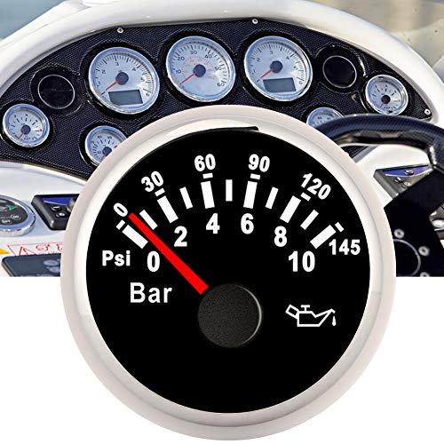 Misuratore di pressione olio 24V 12V, misuratore di pressione olio 2in 0-10bar 145psi Strumento con quadrante retroilluminato a LED per auto moto barca camion 12V/24V(Black Dial Silver Frame)
