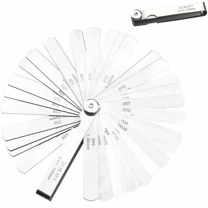 Le 32 lame dello spessimetro sono metriche e imperiali. Spessimetri pieghevoli, facili e comodi da trasportare e riporre. Doppia marcatura, da 0,02 mm (0,0008'') a 1 mm (0,40''), i numeri delle dimensioni sono incisi nello spessimetro per una facile identificazione. Adatto a progettisti, ingegneri, meccanici e meccanici che misurano lo spessore del gioco delle punterie, del gioco delle candele, del gioco dei cuscinetti, fessure delle fasce elastiche e altri punti difficili da raggiungere Avviso: c'è olio antiruggine sullo spessimetro.