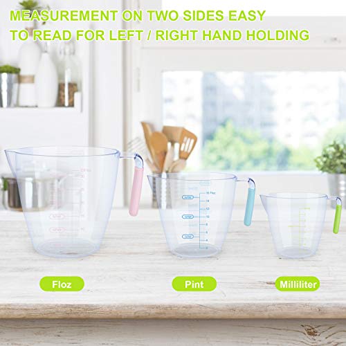 Set di 3 misurini in plastica, infrangibili, trasparenti, con impugnatura e beccuccio, misure facili da leggere