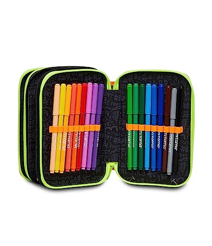 MITAMA Astuccio Scuola 3 Scomparti - TRIPLO METAVERSE, Nero - Contenuto 47 pz - Completo di Matite, Pennarelli etc - Portapenne Scuola Elementare Bambini - Impermeabile