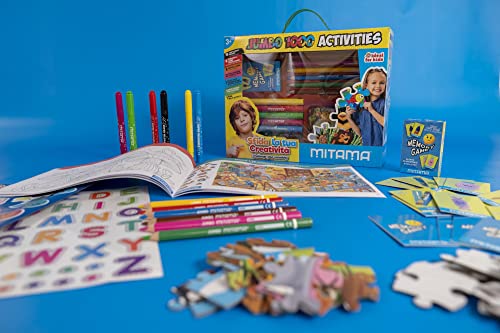 Mitama, Scatole Gioco JUMBO 1000 ACTIVITIES, 24 pz, Pennarelli Lavabili, Pastelli a Cera, Stickers, Book e Cards da Colorare, Giochi di Memoria, Giochi Creativi per Bambini, Giochi Formativi