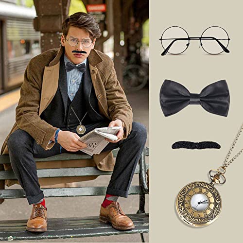 Il set di costumi da uomo include: cappello Panama Gangster * 1, bretella elastica Y-Back * 1, papillon * 1, baffi finti * 6, occhiali * 1, orologio da tasca vintage * 1 (non funzionante).