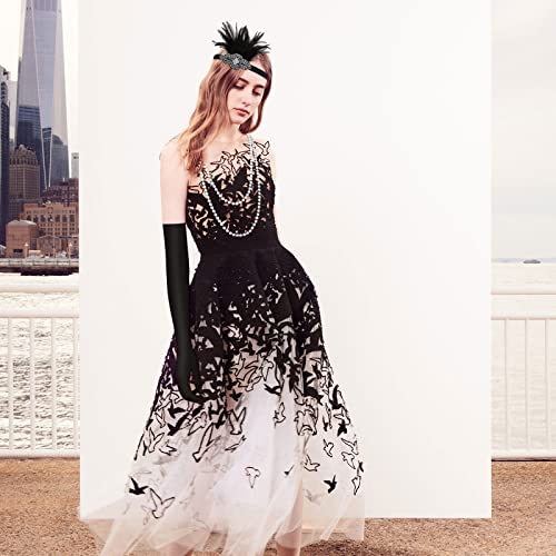 Accessorio in costume vintage: Copricapo di piume nere vintage con elasticità. La taglia si adatta alla maggior parte degli adolescenti e degli adulti, guanti in raso nero liscio ed elasticizzato, classico e facile da indossare, perfetto per il tuo costume da ragazza flapper del 1920.