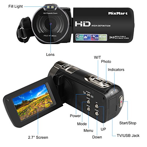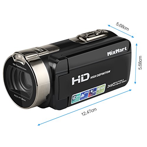 MixMart - Videocamera digitale 1080P, Full HD, 24 Megapixel, zoom digitale 16X, schermo TFT LCD da 2,7", girevole a 270°, registratore digitale