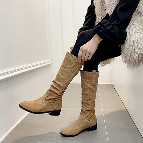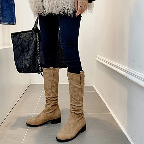 MJIASIAWA Donna Tacco Medio Inverno Classico Senza Chiusura Warm Stivali Arricciati Comfy Tacco A Blocco Casuale Knee Stivali Equitazione Retrò Marrone Numero 52 EU/54 Asiatico