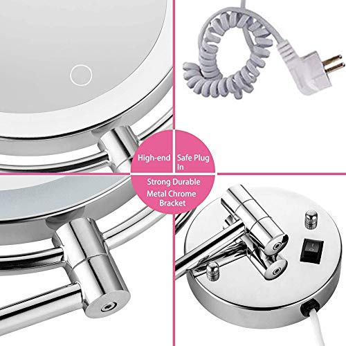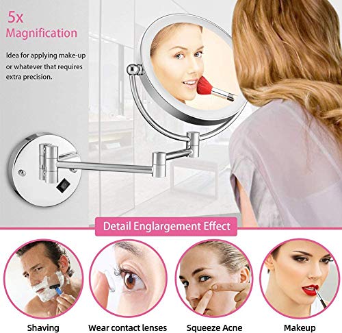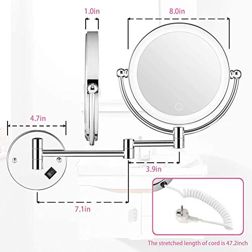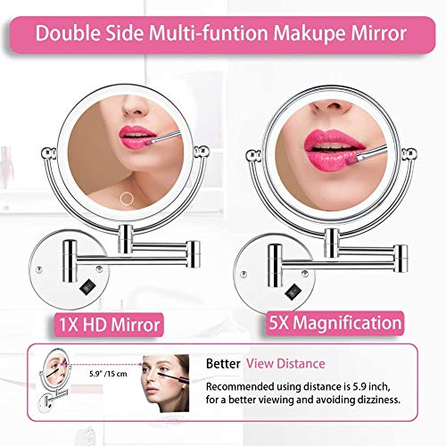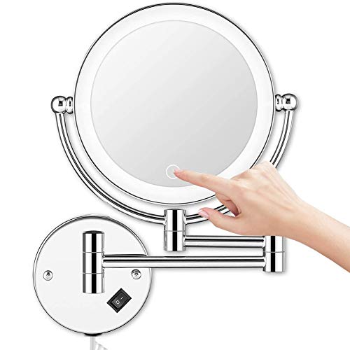 MKYOKO Specchio per il trucco a parete Pulsante a sfioramento LED Luce regolabile in continuo Specchio cosmetico con ingrandimento 1X/5x su entrambi i lati Girevole a 360° Allungabile per