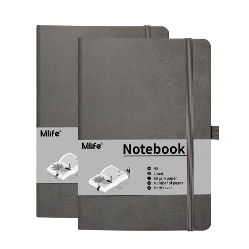 Mlife A5 Quaderno 2 Pack, 192 Pagine, Copertina Rigida Con Chiusura Elastica E Tasca Pieghevole (Grigio)