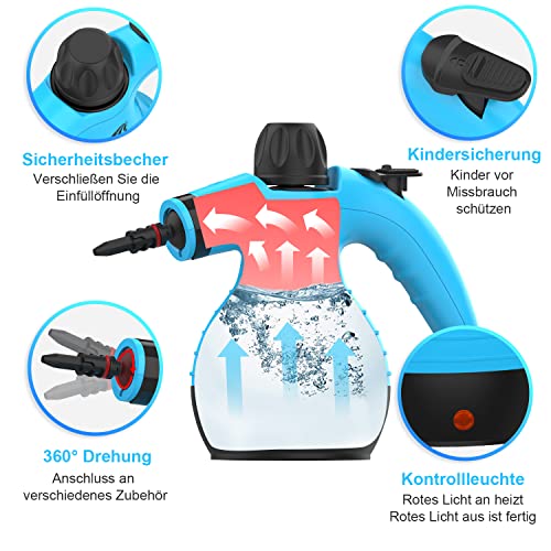 MLMLANT Mano, pulitore a Vapore Portatile di Usi Multipli con 9 Accessori per Rimuovere Macchie, Tappeti, Tende, sedili Auto, Cucina, Pavimento, Plastica
