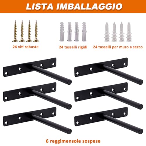 【Facile installazione】: per montare questi supporti sospesi a parete non sono necessarie conoscenze particolari. La confezione include 24 viti a incastro, 24 ancoraggi per cartongesso e 24 ancoraggi in cemento mattone che si adattano molto bene e stabilmente per mantenere intatti i supporti sospesi per scaffali e completare perfettamente il lavoro (scaffale non incluso).