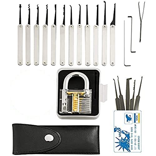 MMOBIEL 25 pezzi, kit di formazione professionale di aghi per serratura con lucchetto trasparente di formazione, strumenti per fabbro e carta di credito del fabbro