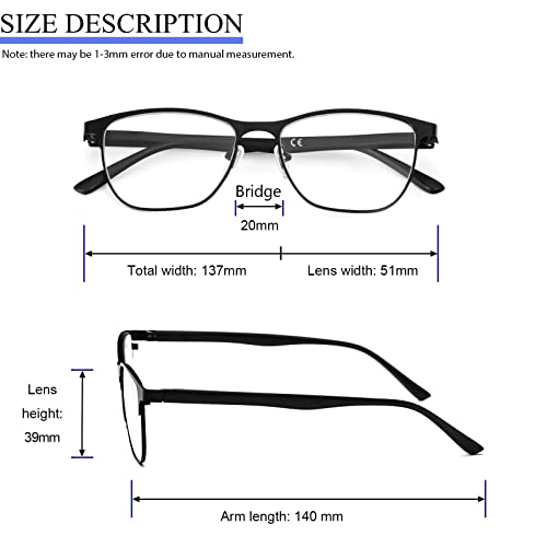 MMOWW Occhiali da lettura da uomo rettangolari con cerniere a molla, montatura in metallo leggera con blocco della luce blu, Nero, 3.0