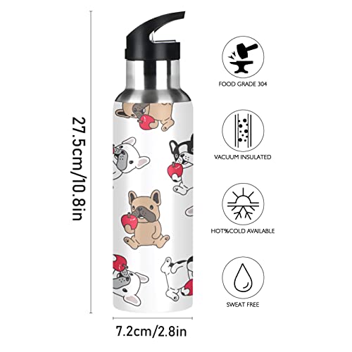 Mnsruu Simpatico Cucciolo di Carlino Cane Bulldog Borraccia Termica con Cannuccia Sportiva, Bottiglia Acqua in Acciaio Inox Isolato 600ML Senza BPA per Bevande Calde e Fredde per Bambini Scuola