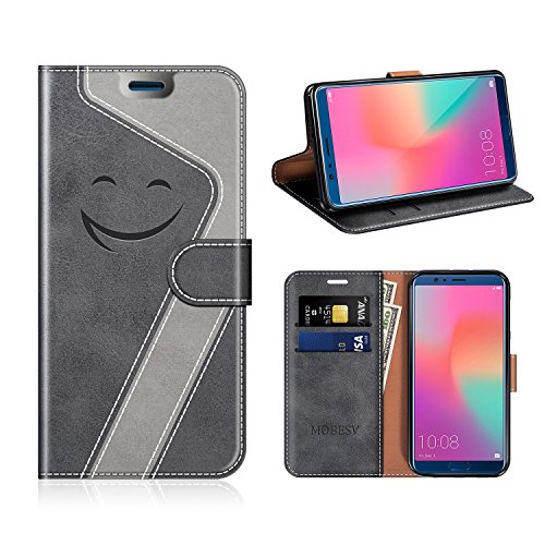 MOBESV Smiley Custodia in Pelle/Portafoglio Cover per Honor View 10, Nero/Grigio