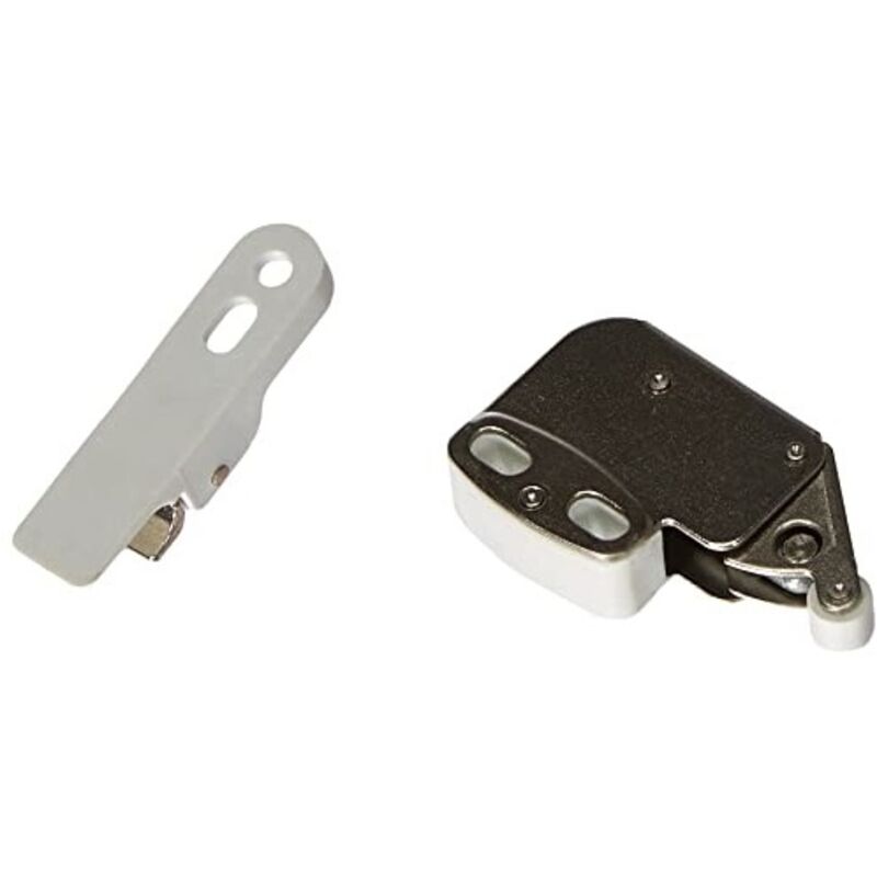 CRICCHETTO BLOCCA ANTINE ARMADI - IN ACCIAIO NICHELATO E PLASTICA BIANCA Caratteristiche: a scatto, apertura con leggera pressione, con viti per inserti, rullino e riscontro in plastica.