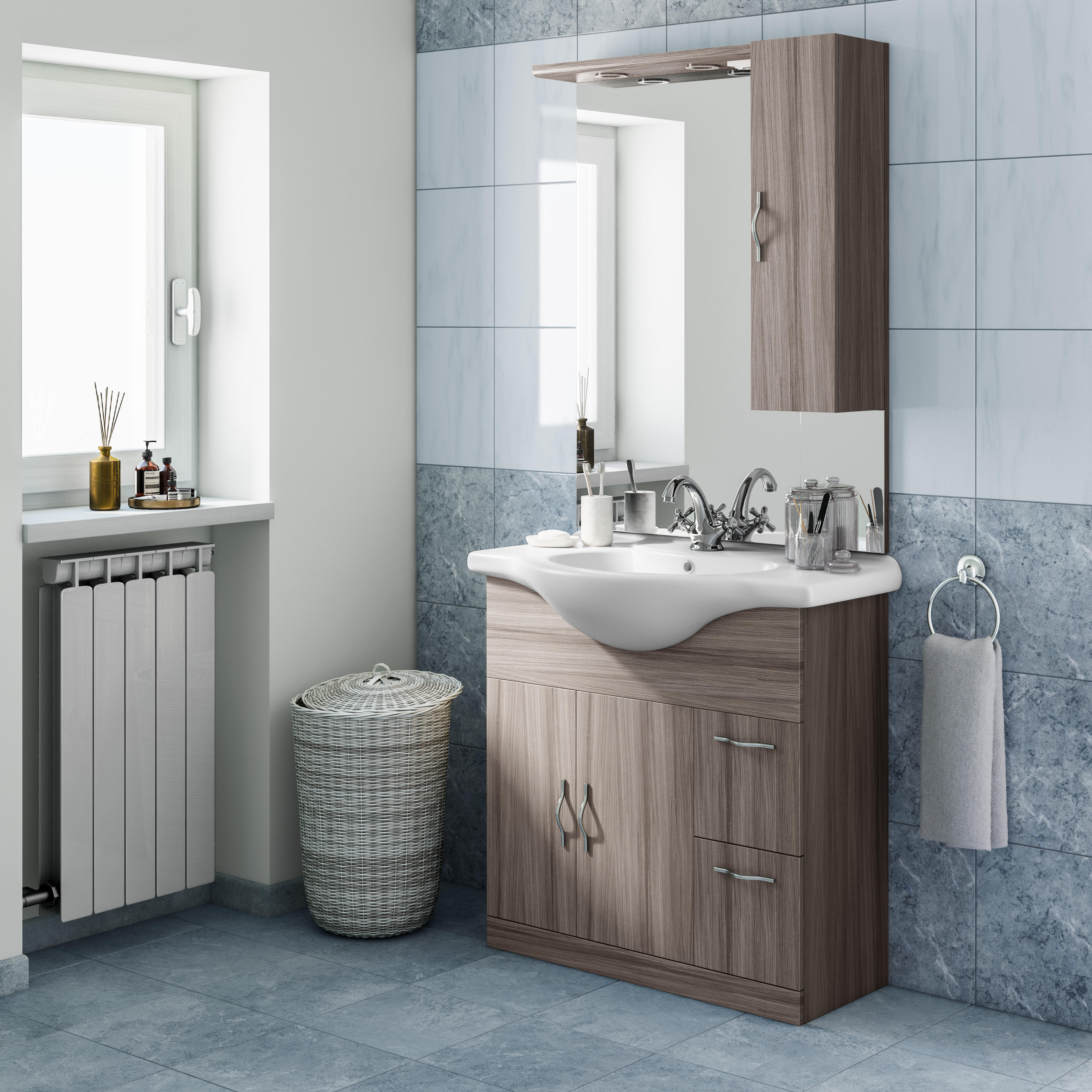 Composto da base sottolavabo a terra a due ante e due cassetti lavabo in ceramica bianco e pensile. Specchio filo lucido e illuminazione led inclusa. Disponibile in diverse varianti dimensioni e finiture.. Appoggio a terra, ideale per pareti che non consentono il fissaggio a muro
