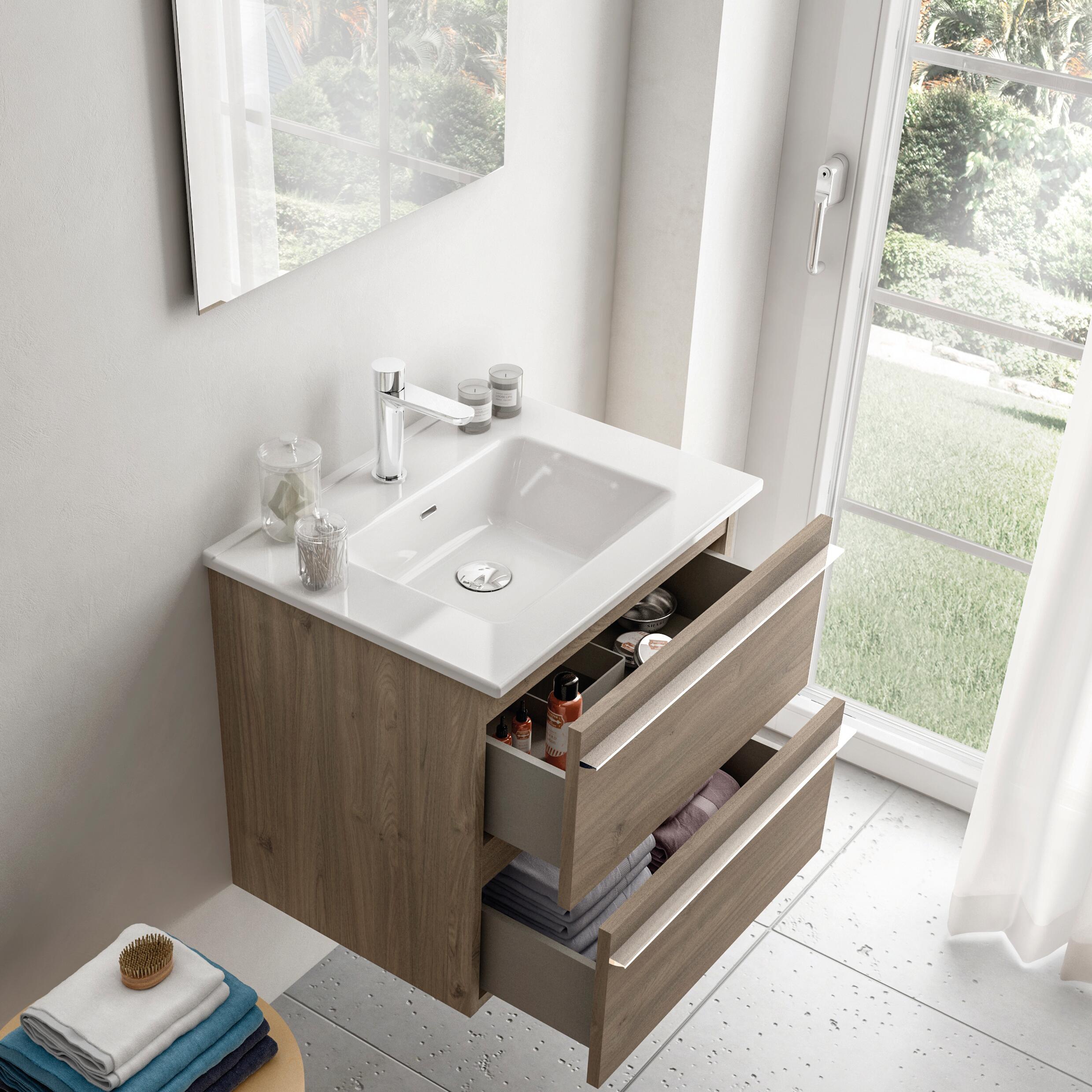 Base lavabo in finitura rovere cotto l60 p46 con 2 cassetti a chiusura soft close e maniglie in alluminio finitura brill, completa di lavabo in ceramica bianco lucido. Indicato per chi cerca praticità e facilità di pulizia del piano lavabo.. Ideale per chi cerca un mobile dall'estetica fresca e contemporana, che si adatti anche a spazi ridotti senza rinunciare alla funzionalità.. La maniglia LINEA con la sua forma minimale, si integra perfettamente alla lunghezza dei frontali divenendo quasi invisibile pur mantenendo l'estrema funzionalità nell'apertura del cassetto.. La profondità di 46 centimetri si adatta anche a spazi ridotti, mantenendo comunque un ottimo bacino del lavabo e un generoso spazio contenitivo del mobile.