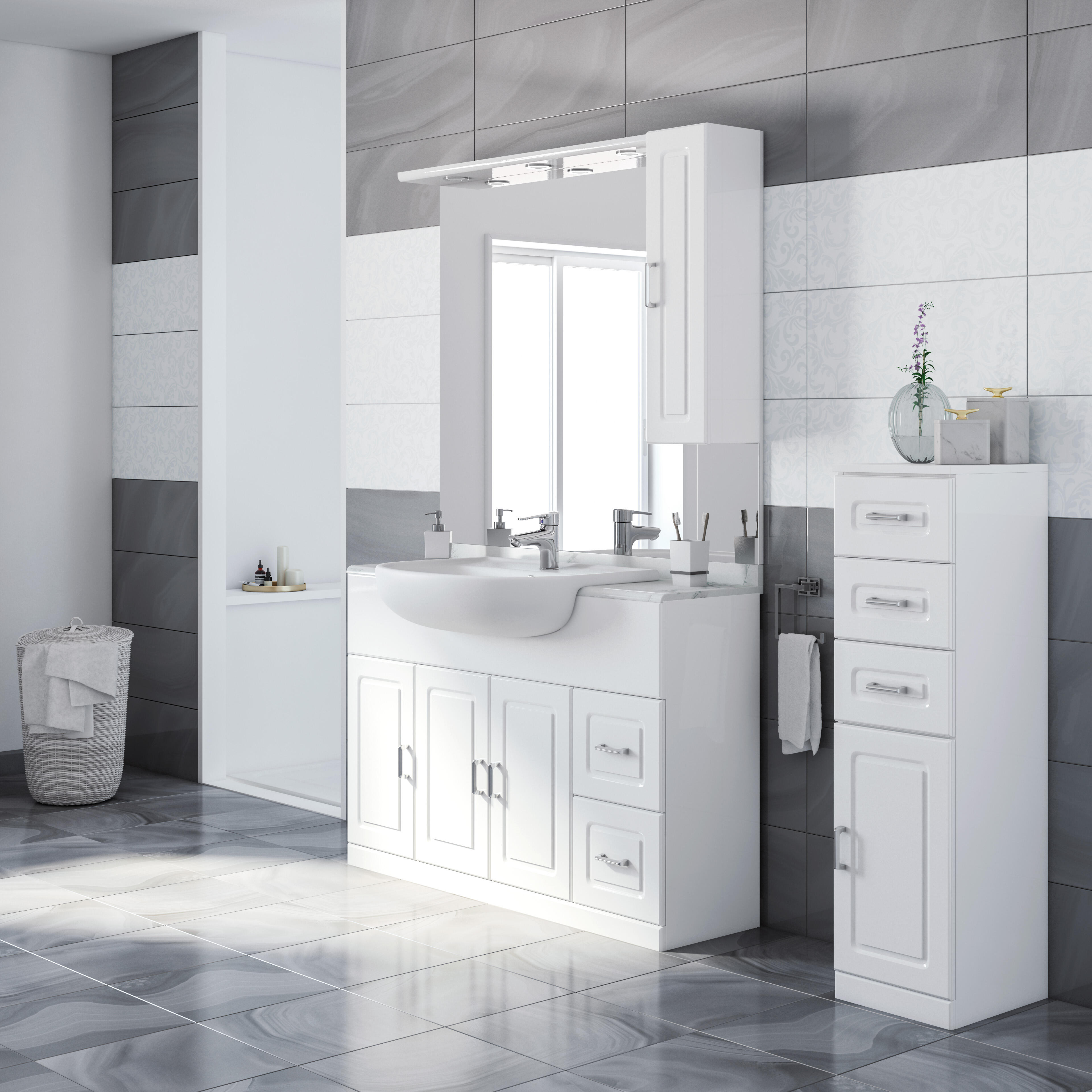 Composto da base sottolavabo a terra a due cassetti e tre ante, lavabo in ceramica bianco e pensile. specchio filo lucido incluso. colonna venduta separatamente. disponibile in diverse varianti dimensioni e finiture.. Appoggio a terra, ideale per pareti che non consentono il fissaggio a muro. Pregiato top in marmo di Carrara dotato di pratico bordino para schizzi. Iluminazione integrata. Tetto con tripla illuminazione e attacco elettrico schuko