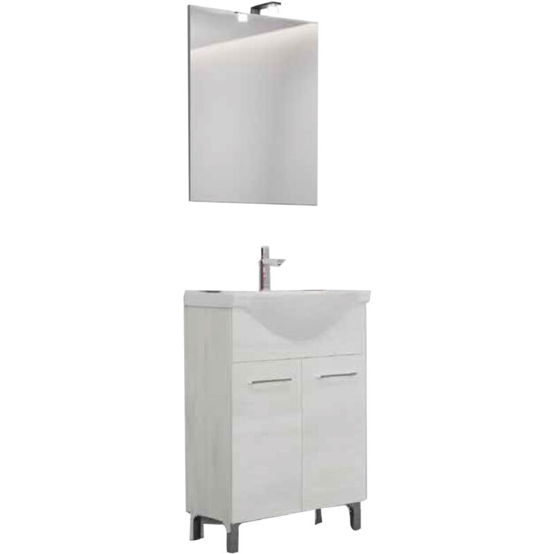 Caratterizzato da un design piacevole, moderno ed elegante per arredo bagno. Composto da base in multistrato impiallacciato in essenza, laccato in rovere grigio a due ante con maniglie, lavabo in ceramica, specchio a filo da 52x68 cm illuminato da lampada a led. Dimensioni espresse (larghezza x profondità x altezza).