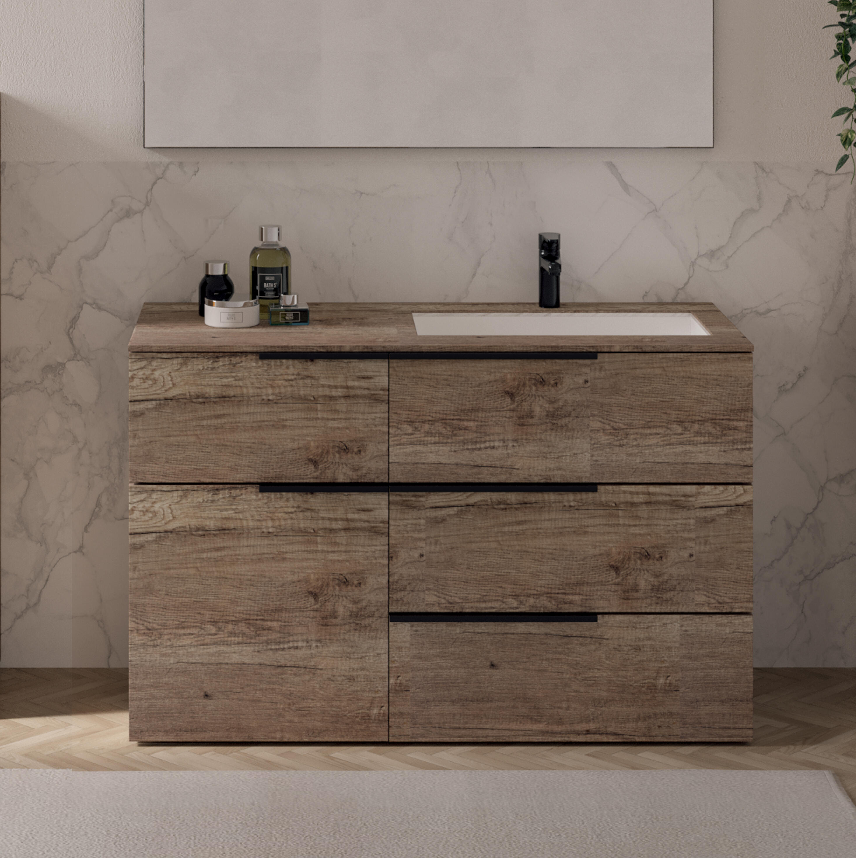 Composizione 1 cassetto e cassettone, 3 cassetti, lavabo, top hpl, lavabo destro