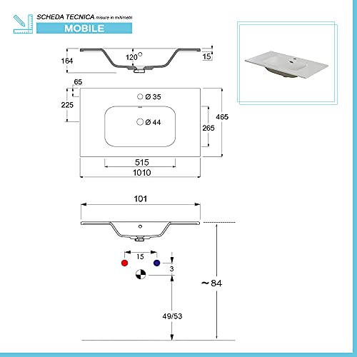 Il mobile bagno ha dimensioni pari a 101x47x84 cm, compreso di piedini da 12,5 cm in ABS dalla finitura cromo - Realizzato in legno melaminico dallo spessore di 18mm