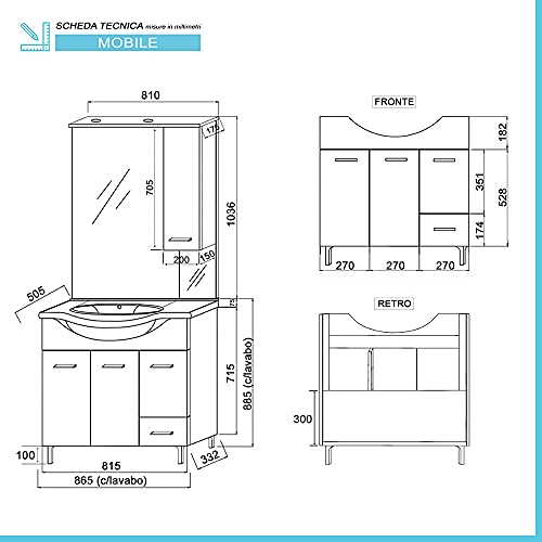 Specchiera: INCLUSA nella composizione da bagno è completa di pensile sul lato destro (apertura anta reversibile). NON è possibile posizionare il pensile sul lato sinistro. Completa di staffe posteriori per il fissaggio a muro. 2 ripiani interni non regolabili