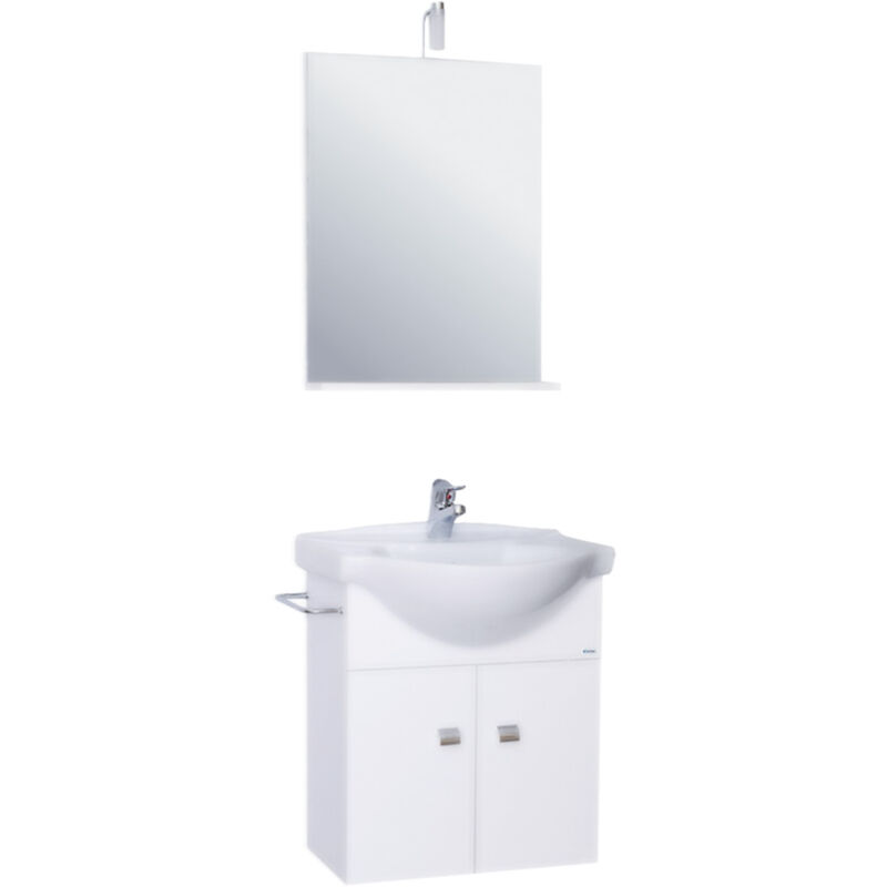 Valida alternativa d'arredo per bagni a dimensioni ridotte. Composto da base in legno laccato bianco lucido a due ante con maniglie, lavabo in ceramica, portasalviette laterale, specchio con illuminazione led superiore. Dimensioni specchio cm.52x70. Dimensioni espresse (larghezza x profondità x altezza).