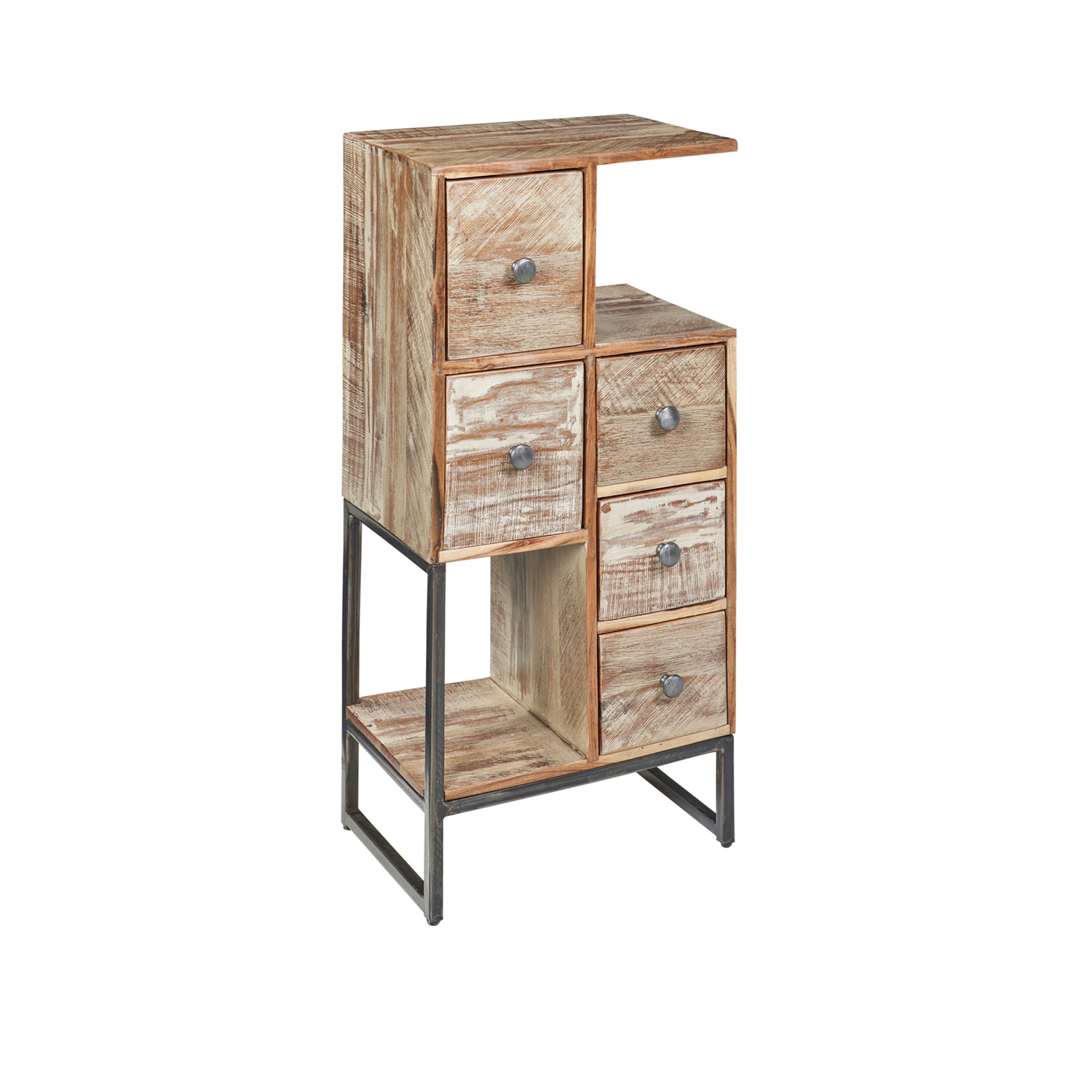 Mobiletto con 5 cassetti e 2 piani, realizzato in acacia con robuste gambe in ferro. L'affascinante disposizione degli elementi ed i contrasti tra colori e materiali rendono questo mobile unico ed in grado di aggiungere un tocco originale ad ogni ambiente di casa e dello studio. Si adatta alla perfezione ad ogni stile di arredo offrendoti tanto spazio per organizzare libri, decorazioni ed oggettistica. Dimensioni: Larghezza 45 cm;
