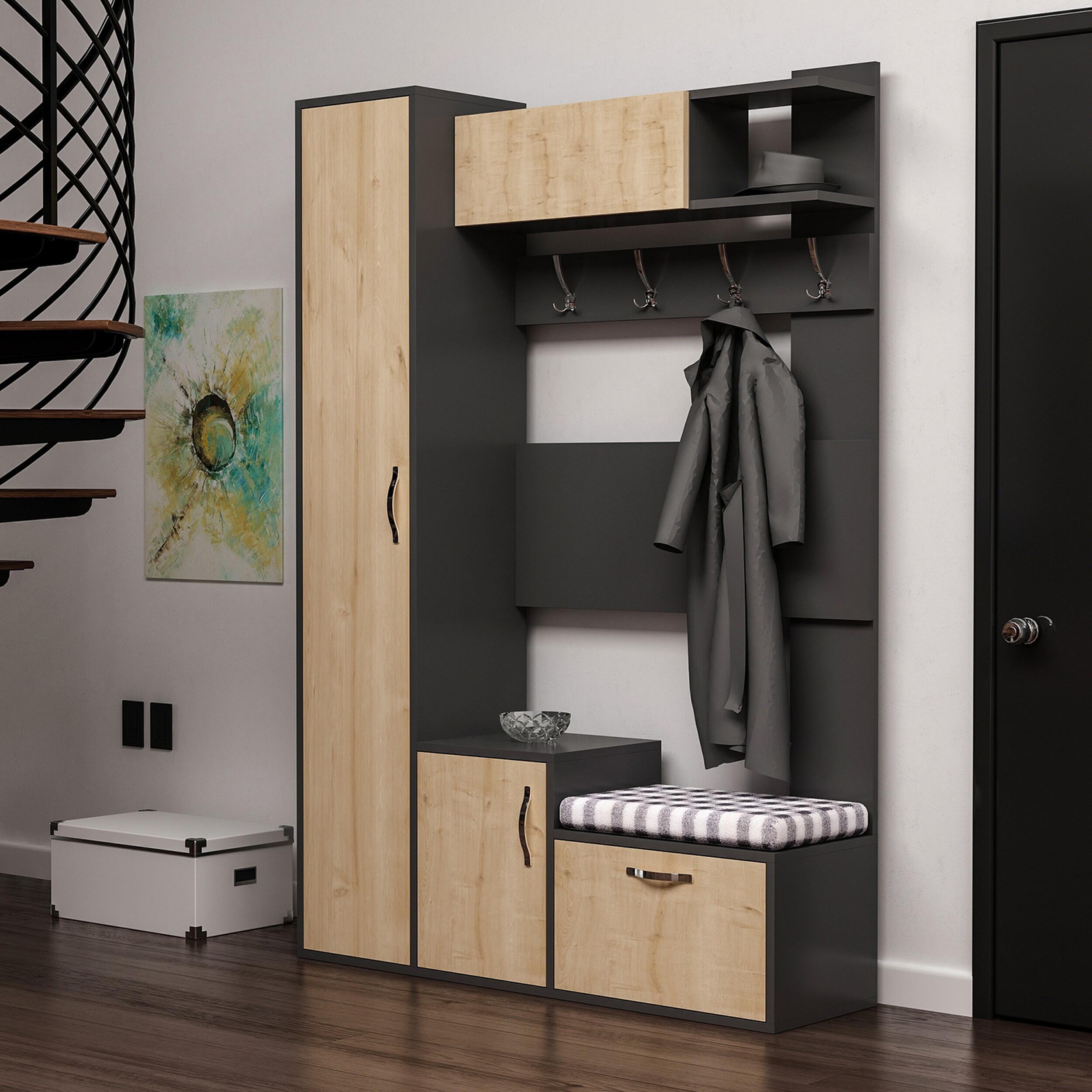 Questo mobile da ingresso, moderno e funzionale, è la soluzione perfetta per tenere in ordine abiti e vari oggetti. Grazie al suo design è ideale per la zona giorno. Colore Rovere, Antracite. Mod. Seina