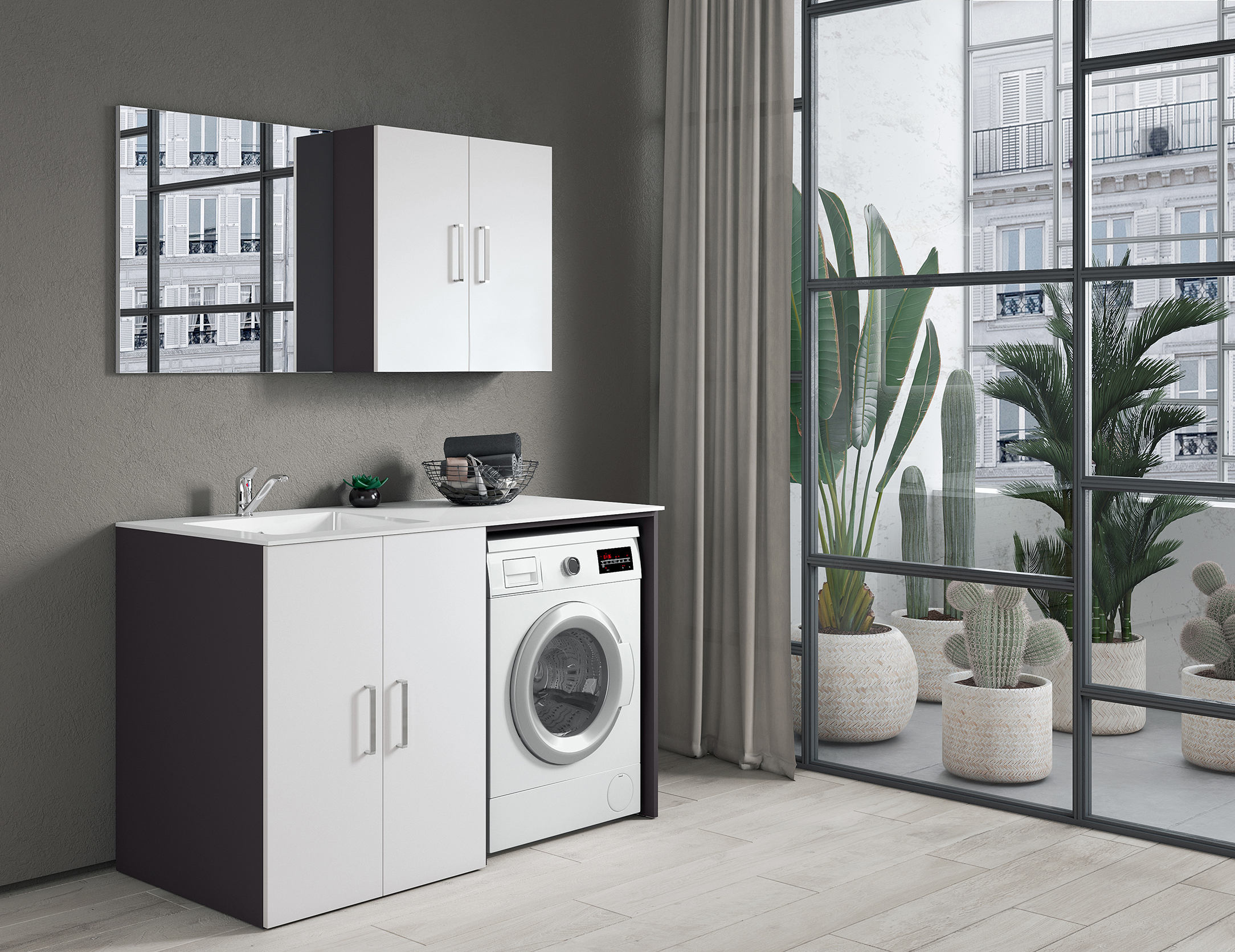 Modulo porta lavatrice DESI grigio ombra L70H90P65,5. Ampio spazio per contenere lavatrice e scarichi. Mobile in kit. Packaging ridotto.
