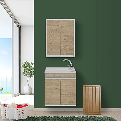 Mobile lavatoio sospeso 60x50 cm, 2 ante con vasca in resina, completo di asse di lavaggio e kit sifone (Rovere)