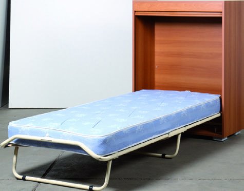 Mobile letto a scomparsa a tapparella su ruote integrate nel piedino,apertura frontale, tinta noce L. cm.85 PROF. cm 40 (aperto cm.209) H. cm.116, comprensivo di rete a doghe ortopedica e materasso.(DISPONIBILE ANCHE BIANCO O NERO)