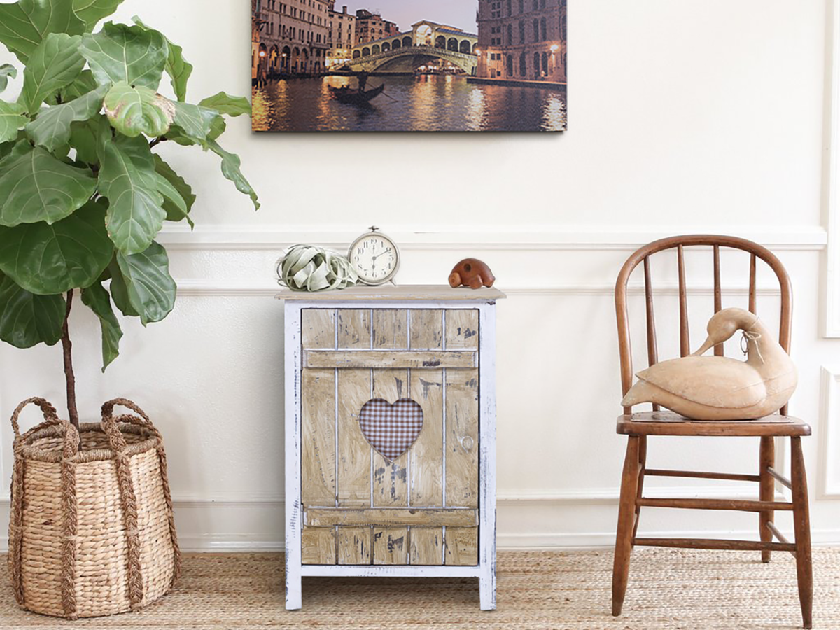 In legno. Comodino shabby chic, ideale per i piccoli spazi, in legno di Paulonia con apertura a forma di cuore. Perfetto per qualunque ambiente della zona giorno, per il bagno o la camera da letto, e' disponibile in diverse tonalita'.