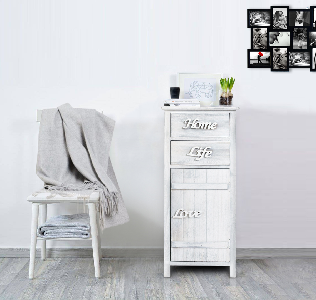 In legno. Comodino shabby adatto alla vostra camera o al vostro bagno, pratico e funzionale dara' un tocco originale alla vostra casa, si adatta bene a tutti gli ambienti. Il mobiletto è di fatto in legno e la sua tonalita' e' data dalla naturelezza dello stesso. Il mobiletto ha un'anta e due cassetti non vi sono ripiani interni.
