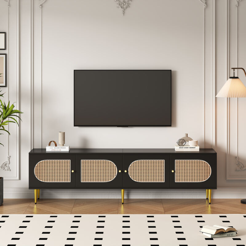SPAZIO DI STOCCAGGIO FLESSIBILE Piastra di inserimento regolabile per opzioni di stoccaggio versatili. GESTIONE DEI CAVI Quattro fori per instradare e organizzare ordinatamente i cavi. Carico di peso stabile. Il mobile può sostenere 50 kg e può contenere televisori fino a 80 pollici. Per facilitare il trasporto, il nostro mobile TV è rotto e deve essere assemblato, la scrivania non fa parte dell'intero pannello. Scopri l'eleganza moderna e la bellezza naturale con il nostro mobile TV in rattan nero. Con dimensioni di 180x40x50 cm, questo mobile offre spazio sufficiente per televisori fino a 80 pollici, rendendolo la scelta perfetta per soggiorni ampi. Il contrasto tra il corpo nero e le ante in rattan color caffè conferiscono a questo mobile un tocco elegante ed esotico che valorizzerà qualsiasi soggiorno. Il mobile TV è dotato di quattro ante in rattan, che non solo hanno un bell'aspetto ma offrono anche un pratico spazio per riporre gli oggetti. Le due porte centrali possono essere