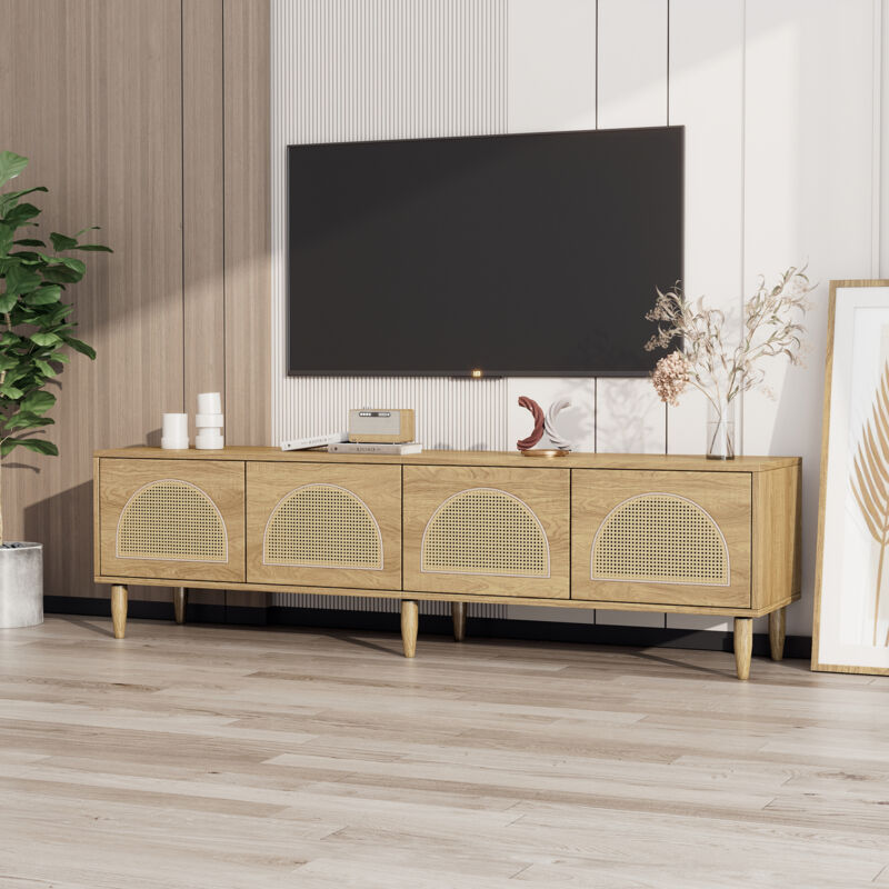 COSTRUZIONE ROBUSTA Sei gambe, due delle quali regolabili in altezza per la massima stabilità, supportano fino a 50 kg e possono contenere una TV fino a 80 pollici. GESTIONE DEI CAVI Quattro fori per guidare e organizzare ordinatamente i cavi Durevole e robusto Per rendere il tavolo più forte e durevole, il nostro supporto TV interrompe quindi il piano del tavolo, deve essere assemblato, il piano del tavolo non è un piatto intero Nota: Questo prodotto è composto da 2 pacchi e potrebbe non arrivare contemporaneamente. Assicurati che entrambi i pacchi siano arrivati prima di iniziare il montaggio! Porta eleganza rustica e funzionalità nel tuo soggiorno con il nostro mobile TV in legno e rattan. Con dimensioni di 180x40x51 cm, questo mobile offre spazio sufficiente per televisori fino a 80 pollici, rendendolo l'aggiunta perfetta a spazi abitativi più ampi. La combinazione di robusti pannelli truciolari e ante in rattan realizzate a mano conferisce a questo mobile un fascino naturale ed