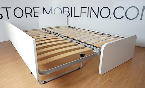 Secondo letto estraibile con ruote, estraibile e sollevabile con gambe a scatto per formare un letto matrimoniale.