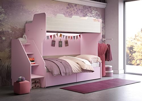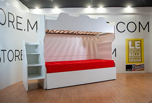 MOBILFINO CAMERETTE SMART - Letto a castello con secondo letto estraibile con scaletta contenitore indipendente - Bianco e Rosso, con cassettoni estraibili