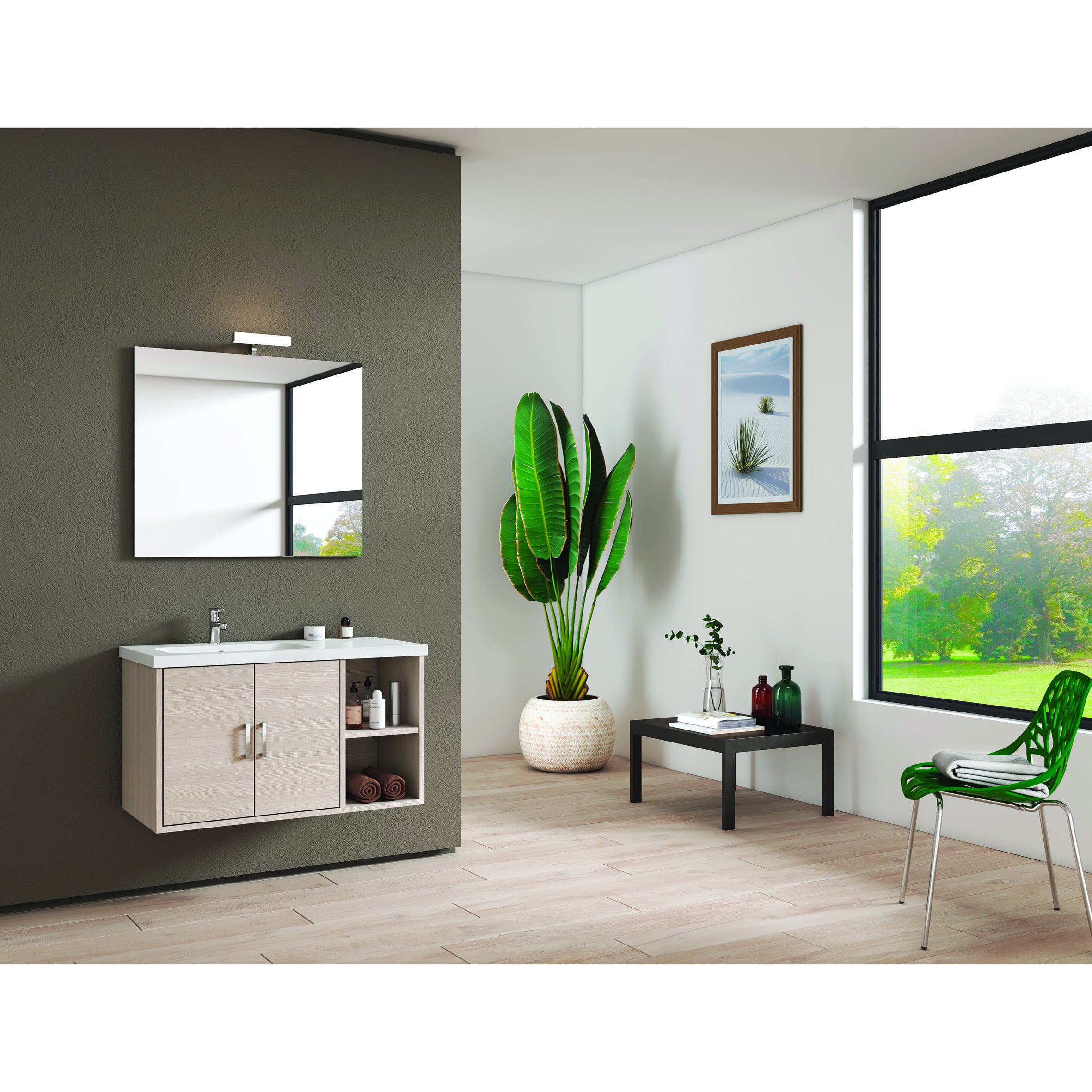 Composizione Belfast larice composta da base p/lavabo con 2 ante e vano a giorno, lavabo in ceramica con vasca a sinistra, specchio a filo 81 x 70 cm e lampada a LED 3W 230V. Dimensioni mobile: L91 H190 P46 cm. Ideale per chi cerca un mobile dall'estetica fresca e contemporana. Installazione sospesa, ideale per una più facile pulizia e utilizzo del bagno. Lavabo in ceramica con ampia vasca e ampia superficie d'appoggio. Pratico e e facile da pulire. Chiusura soft closing. Garantisce una chiusura rallentata e silenziosa