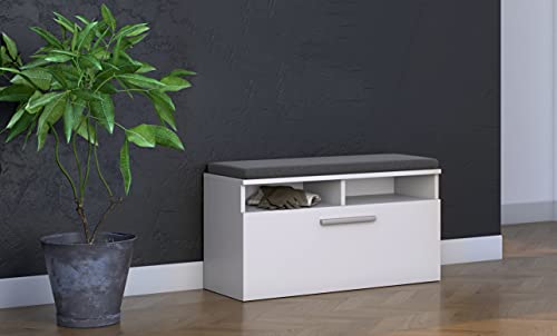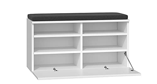 ADGO Riva Mobili per corridoio, guardaroba, scarpiera con seduta e portaoggetti, 6 ripiani per scarpe, porta basculante, panca con vano portaoggetti, cuscino per scarpe (scarpiera, bianco)
