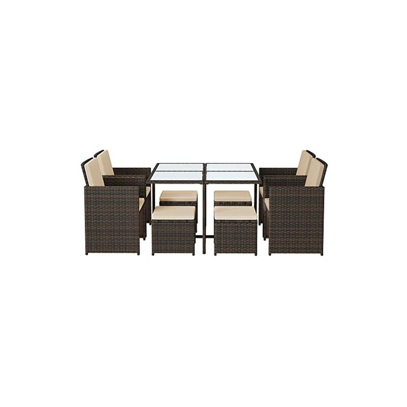 Salvaspazio intelligente! Che sia l'ora del tè per 2 o una cena per 8 persone, questo set da pranzo all'esterno proteggerà te e il tuo piatto. Un salvaspazio per eccellenza con il suo design intelligente che offre 8 posti a sedere ma occupa solo lo spazio di 1 tavolo quando non è in uso! Montaggio semplice: Le istruzioni chiare, i fori praticati con precisione e il video di montaggio ti aiuteranno! Puoi anche collaborare con gli amici e parlerai di Ti ricordi quando abbiamo assemblato questo set insieme? anni dopo Look chic senza sforzo: Aspettati una grande dose di estetica moderna con questo set di mobili da pranzo per esterni che presenta un profilo semplice e un aspetto rinfrescante in PE-rattan. Rende ogni pasto in famiglia all'aperto un vero piacere! Dura per anni: Questo set di mobili da giardino, che resiste alla prova del tempo, sarà una presenza fedele grazie alla sua spessa struttura in acciaio, rattan PE di qualità e resistente piano in vetro temperato Mettiti comodo: I