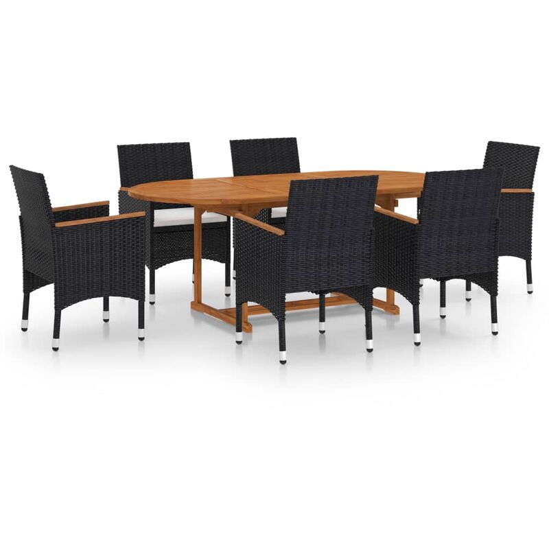 Aggiungete un elemento dall'estetica accattivante nel vostro giardino grazie a questo set da pranzo! Il tavolo da pranzo è realizzato in legno massello di acacia ed è robusto e resistente. La superficie ad olio lo rende adatto per l'uso in ambienti esterni. Caratterizzate da un telaio in acciaio rivestito in rattan PE resistente agli agenti atmosferici, le sedie da pranzo sono robuste e facili da pulire. I braccioli, splendidamente decorati, in legno massello di acacia aggiungono un tocco di fascino rustico. I cuscini dalla spessa imbottitura forniscono ulteriore comodità. Nota: per prolungare la vita dei vostri mobili da esterno, consigliamo di pulirli regolarmente e di non lasciarli all'aperto senza protezione quando non vengono utilizzati.Pulizia: utilizzare una soluzione con sapone delicatoConservazione: se possibile, conservare i mobili in un ambiente chiuso, fresco e asciutto. Se il prodotto viene conservato all'aperto, proteggerlo con una copertura impermeabile. Pulire e