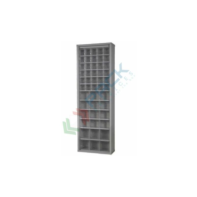 SCAFFALE PORTAMINUTERIA CON 48 CASSETTI Scaffalatura in lamiera elettrosaldata, verniciato in polvere epossidica, con 48 cassetti, Mis. 665 L x 250 P x 2000 H mm. Scaffale composto da 2 cassettiere Cod. Art. CRBOX-4S + 4 cassettiere Cod. Art. CRBOX-3S + 6 cassettiere Cod. Art. CRBOX-5S. Scaffale con cassettiere porta minuteria fornito già montato. Colore struttura grigio chiaro RAL 7035, cassettiere colore grigio scuro simile RAL 7016. Caratteristiche tecniche: Misura: 665 L x 250 P x 2000 H mm Colore struttura: Grigio chiaro RAL 7035 Colore cassette: Grigio scuro simile RAL 7016 Capacità di carico: 170 Kg Capacità Lt: 47,4 Lt Temperatura di esercizio: - 50° + 150° C Lo scaffale è allestito con: 2 cassettiere 600 L x 200 P x 215 H mm, con 3 cassetti, colore grigio scuro - Capacità singolo cassetto 2,5 Lt / 13 Kg (Cod. Art. CRBOX-4S) 4 cassettiere 600 L x 155 P x 175 H mm, con 3 cassetti, colore grigio scuro - Capacità singolo cassetto 1,9 Lt / 13 Kg (Cod. Art. CRBOX-3S) 6 cassettiere