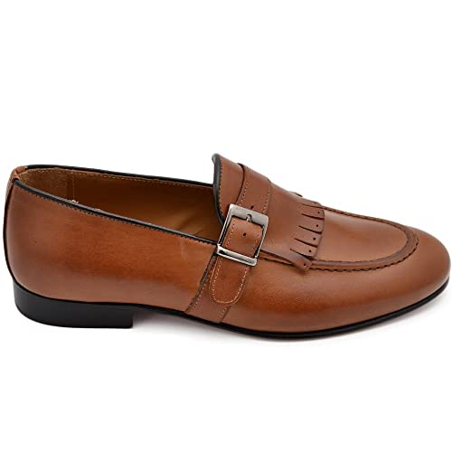 Mocassino Derby Uomo Cuoio in Vera Pelle Crust con Fibbia Frange Linea Dandy Vintage Suola in Vero Cuoio con Antiscivolo (45 EU)