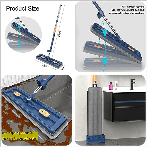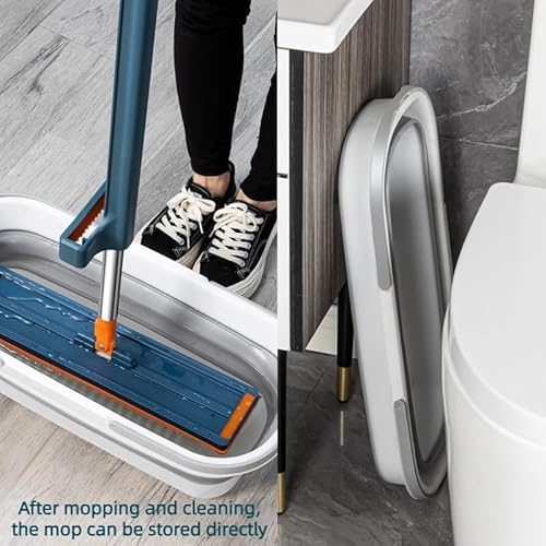 Mocio Piatto Grande in un Nuovo Stile con Secchio,Mop Asciutto E Bagnato In Microfibra con Raschietto Di Disidratazione Autonomo E 4 Cuscinetti In Microfibra (Blue)