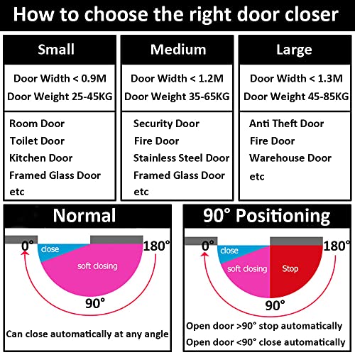 【 Ampia Applicazione 】 Si applica a un peso della porta compreso tra 45 e 85 kg, larghezza della porta compresa tra 900 e 1300 mm, la porta può essere aperta fino a 180 gradi. adatto per porte esterne/interne, porte destre e sinistre.