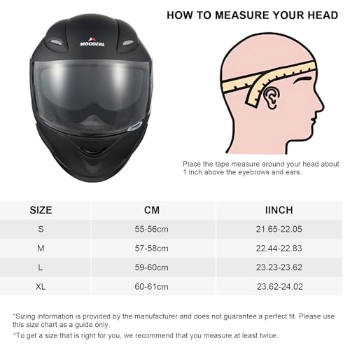 Selezione della taglia: La dimensione può essere facilmente determinata misurando la circonferenza della testa direttamente sopra le sopracciglia. Ricorda che il casco da motociclista deve aderire perfettamente a tutta la testa senza esercitare pressione. Puoi capire la vestibilità corretta dal fatto che il cuoio capelluto si sposta sulla fronte quando il casco viene ruotato. L'imbottitura interna si deforma ancora un po' durante l'uso;