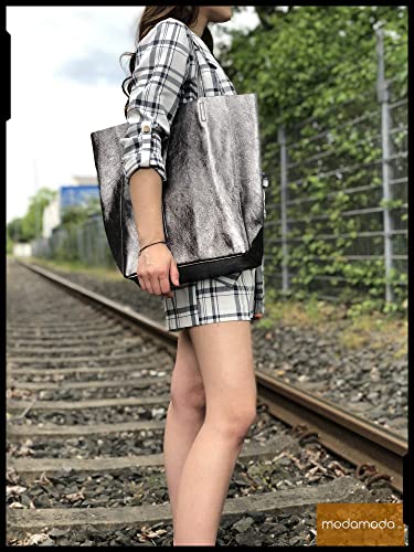 Modamoda de - T163 - Ital - Borsa shopper grande con tasca interna in pelle, Grigio-verde, Large
