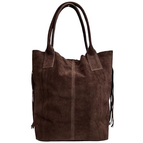 Modarno Borsa shopper da donna in vera pelle scamosciata con frangia più custodia per gioielli dello stesso colore - Borsa a mano - Borsa a spalla (Marrone)