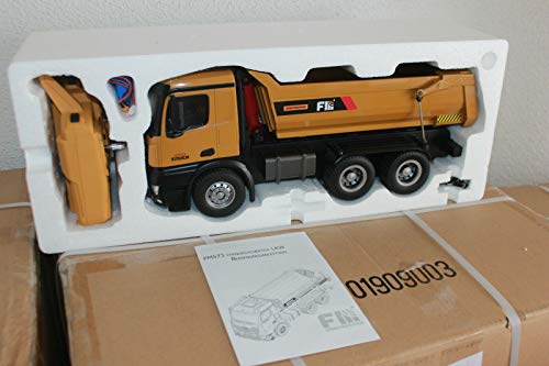 MODELTRONIC Huina 1582 - Camion radio di controllo in metallo, scala 1/14, con ribaltabile, RTR, movimenti proporzionali con luci e suoni + batteria al litio extra Mercedes Actros